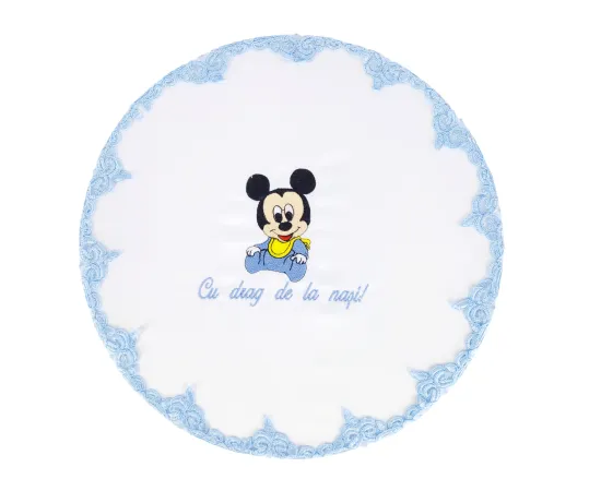 - Panza mir - este realizată din bumbac, de inalta calitate, cu dimensiunea de 70 cm x 70 cm, decorata pe margine si impaturata in dantela;