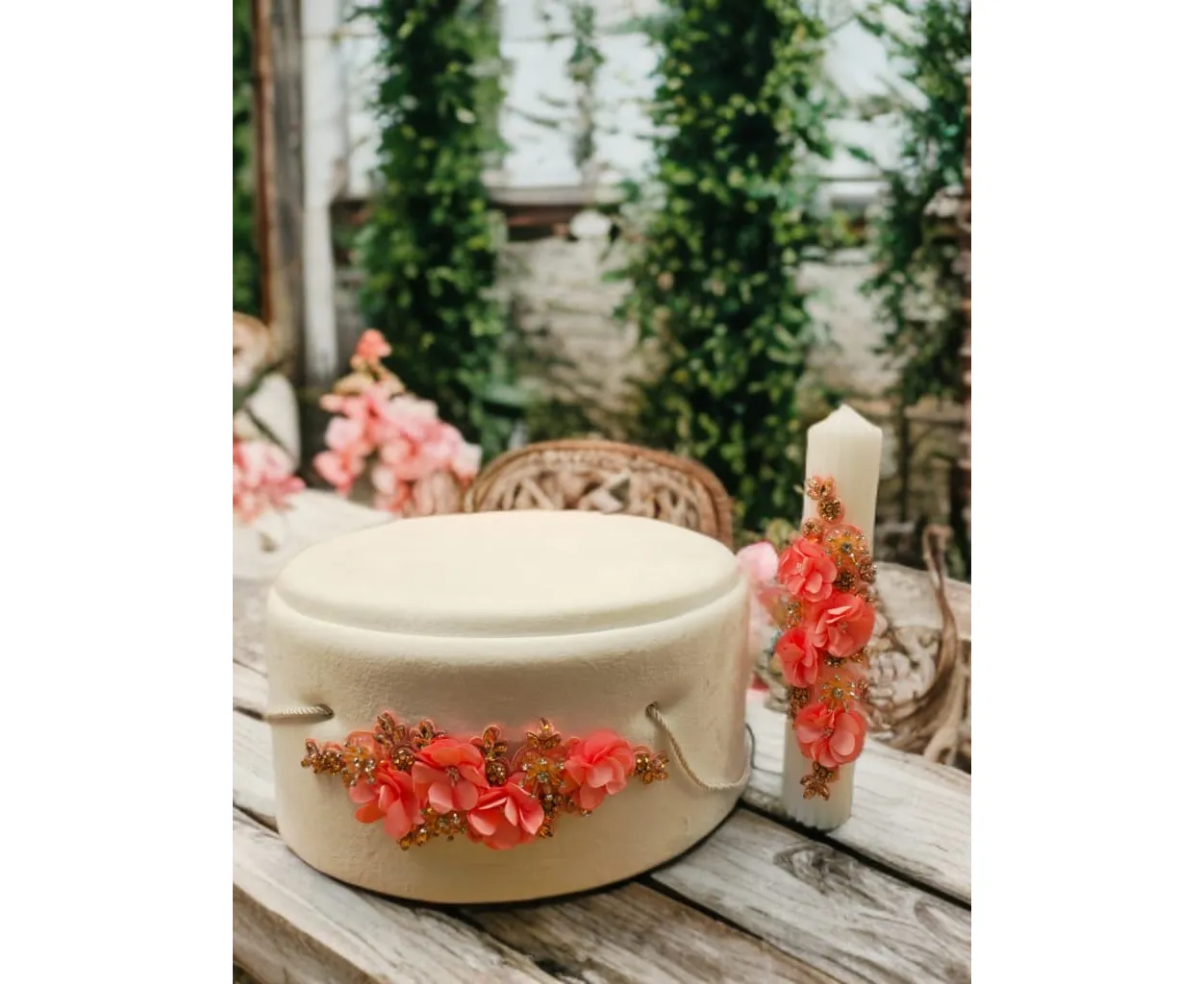 Trusou Botez cu 8 Piese + Cutie Catifea + Lumanare - Flori Portocalii - TB904