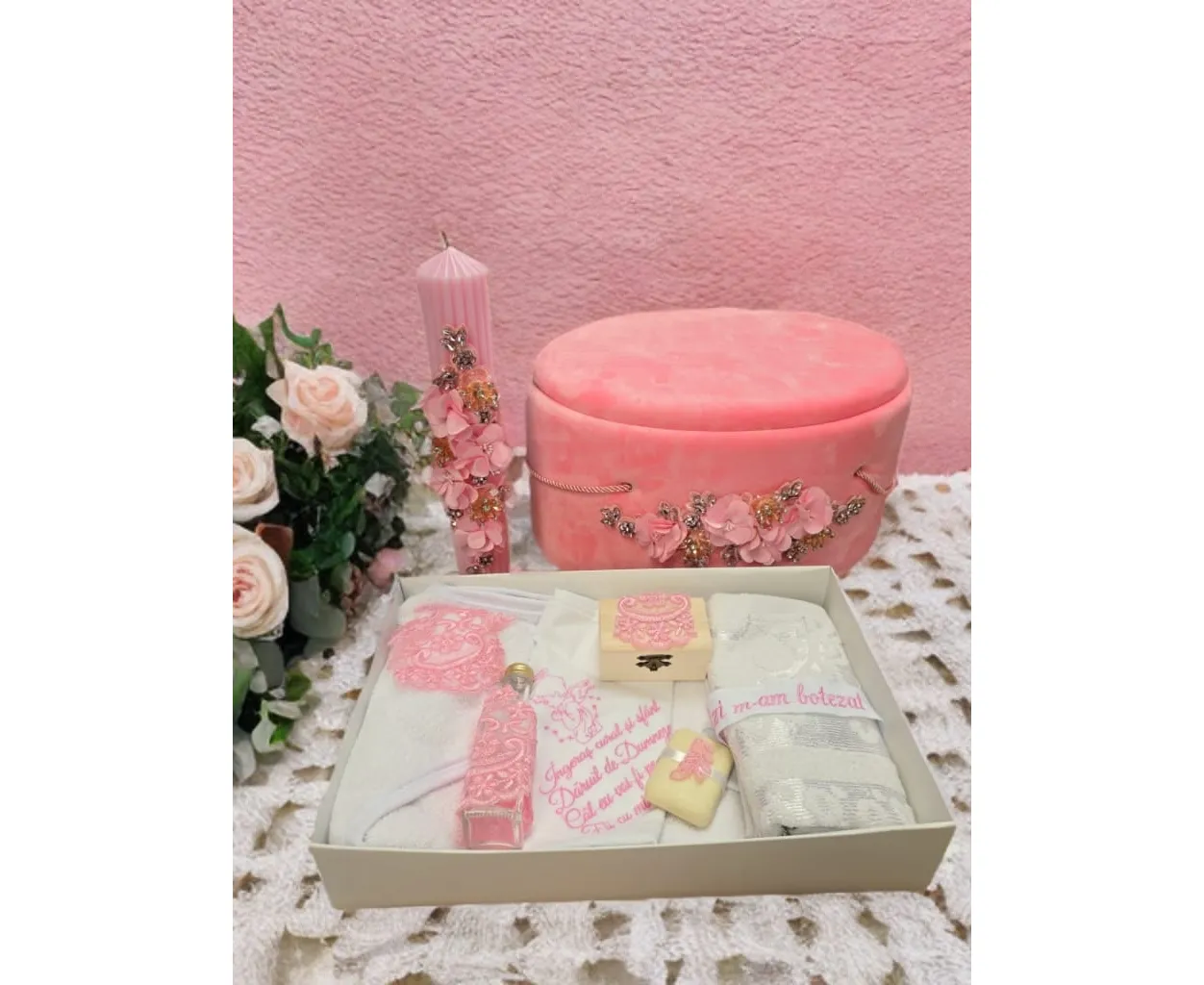 Deoarece botezul este un eveniment important pentru parinti si nasi, venim in ajutor cu un set care contine toate cele necesare pentru crestinarea bebelusului