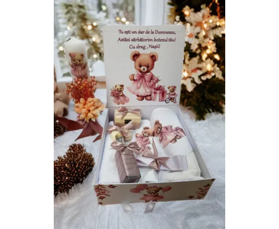 Deoarece botezul este un eveniment important pentru parinti si nasi, venim in ajutor cu un set care contine toate cele necesare pentru crestinarea bebelusului