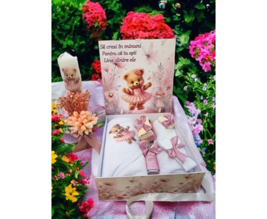 Deoarece botezul este un eveniment important pentru parinti si nasi, venim in ajutor cu un set care contine toate cele necesare pentru crestinarea bebelusului
