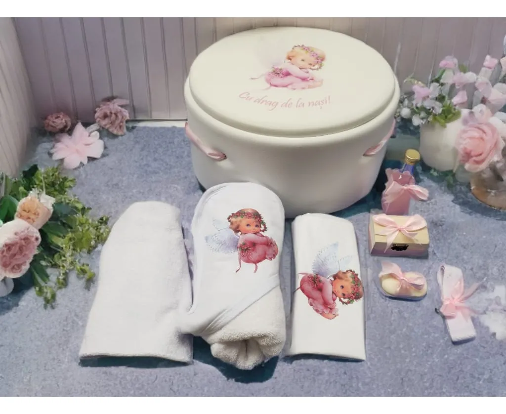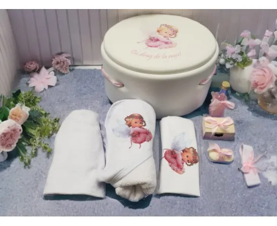 - Prosop pentru bebelus – din material moale deosebit de absorbant,din bumbac de cea mai buna calitate. Prosopul este decorat cu dantela si cu diferite mesaje. Dimensiunea prosopului este de 80 cm x 80 cm, suficient pentru a sterge bebelusul si pentru a-l tine infasurat pe parcursul ceremoniei;