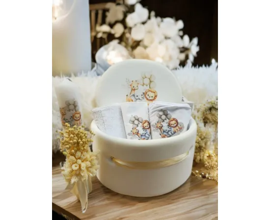- Prosop pentru bebelus – din material moale deosebit de absorbant,din bumbac de cea mai buna calitate. Prosopul este decorat cu dantela si cu diferite mesaje. Dimensiunea prosopului este de 80 cm x 80 cm, suficient pentru a sterge bebelusul si pentru a-l tine infasurat pe parcursul ceremoniei;