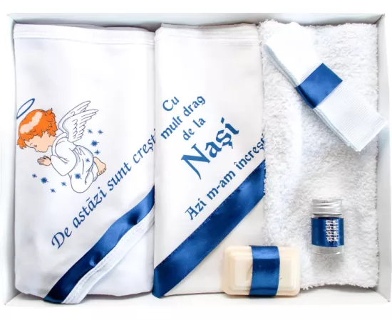Pentru ca botezul este un eveniment important pentru parinti si nasi, venim in ajutor cu un set care contine toate cele necesare pentru crestinarea bebelusului