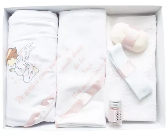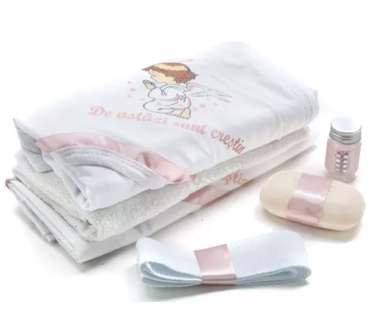 - Prosop pentru bebelus – din material moale deosebit de absorbant,din bumbac de cea mai buna calitate. Prosopul este decorat cu dantela si cu diferite mesaje. Dimensiunea prosopului este de 80 cm x 80 cm, suficient pentru a sterge bebelusul si pentru a-l tine infasurat pe parcursul ceremoniei.