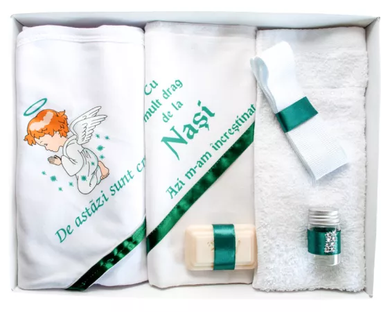 Pentru ca botezul este un eveniment important pentru parinti si nasi, venim in ajutor cu un set care contine toate cele necesare pentru crestinarea bebelusului