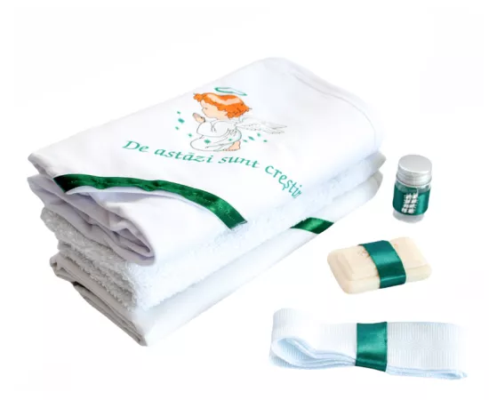 - Prosop pentru bebelus – din material moale deosebit de absorbant,din bumbac de cea mai buna calitate. Prosopul este decorat cu dantela si cu diferite mesaje. Dimensiunea prosopului este de 80 cm x 80 cm, suficient pentru a sterge bebelusul si pentru a-l tine infasurat pe parcursul ceremoniei.