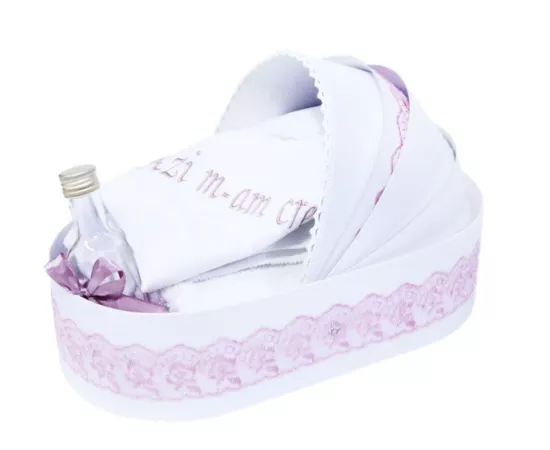 Trusou Botez tip Landou cu 6 piese - Alb-Roz pudrat - "Azi m-am crestinat" - TBL01