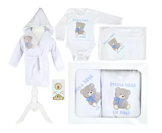 Transformă prima băiță de după botez într-un moment special și plin de emoție! Acest set complet pentru băița de mir este alegerea ideală pentru părinți și nași care își doresc un trusou elegant, practic și de calitate pentru creștinarea bebelușului.