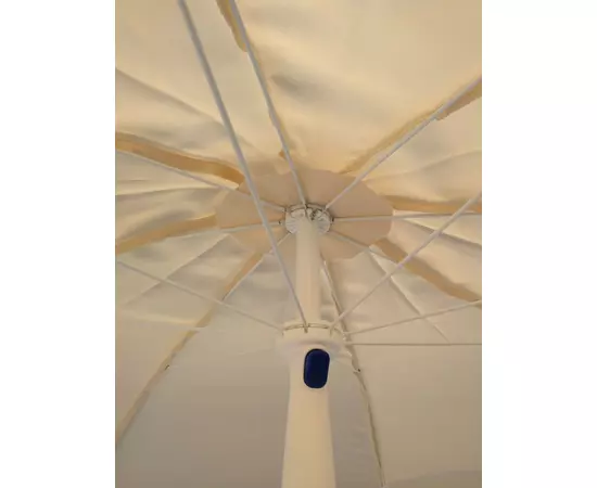 Umbrela are structura fabricata din metal vopsit alb electrostatic, cu 8 spite si varf inclinabil.