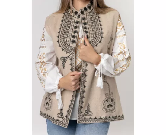Vesta traditionala crem din stofa cu motiv floral negru. Modelul de vesta ofera lejeritate la purtare, intrucat nu prezinta inchidere.