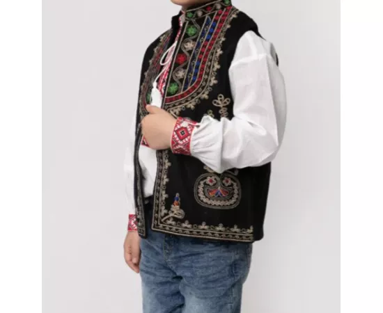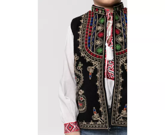 Vesta traditionala pentru baieti neagra din stofa cu motiv floral multicolor. Modelul de vesta ofera lejeritate la purtare, intrucat nu prezinta inchidere.