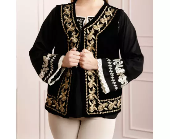 Vesta traditionala neagra din stofa cu motiv floral auriu. Modelul de vesta ofera lejeritate la purtare, intrucat nu prezinta inchidere.