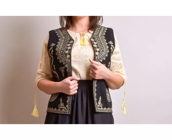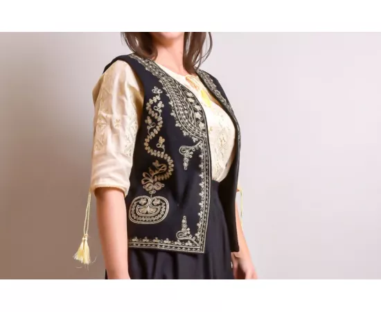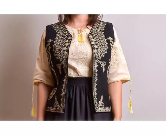Vesta traditionala neagra din stofa cu motiv floral crem. Modelul de vesta ofera lejeritate la purtare, intrucat nu prezinta inchidere.