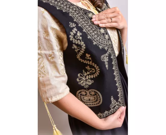 Vesta Traditionala Neagra cu Broderie Florala Crem, de Dama - VT07