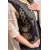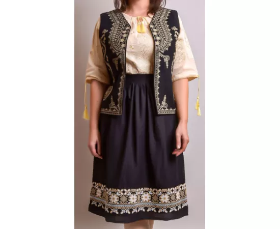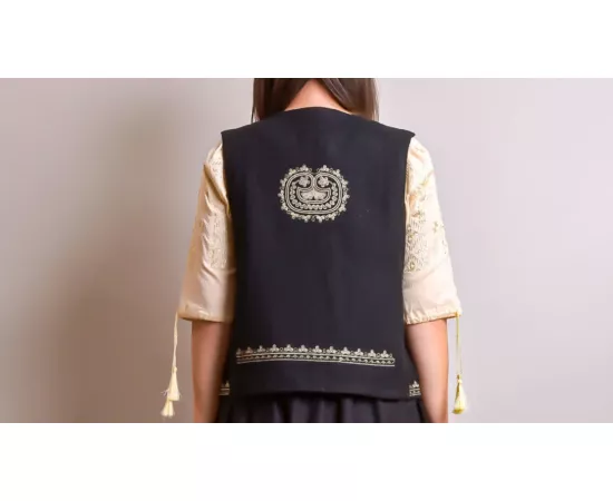 Vesta traditionala neagra din stofa cu motiv floral crem. Modelul de vesta ofera lejeritate la purtare, intrucat nu prezinta inchidere.