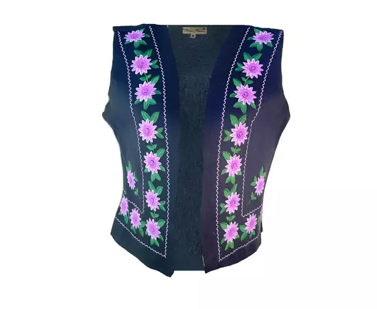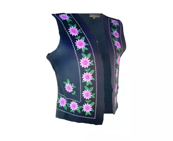 Vesta traditionala neagra din stofa cu motiv floral mov. Modelul de vesta ofera lejeritate la purtare, intrucat nu prezinta inchidere.