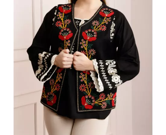 Vesta traditionala neagra din stofa cu motiv floral rosu. Modelul de vesta ofera lejeritate la purtare, intrucat nu prezinta inchidere.