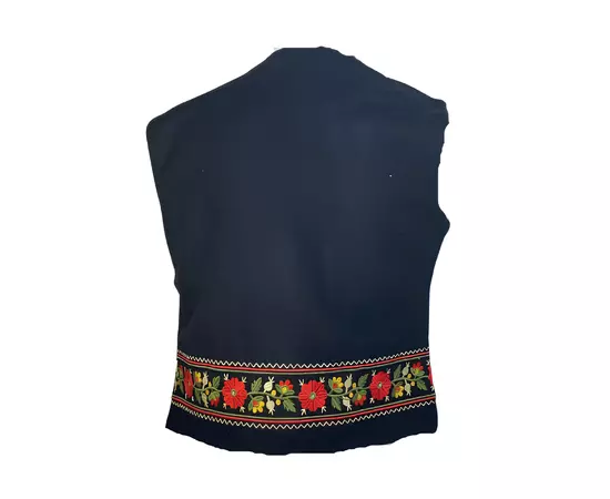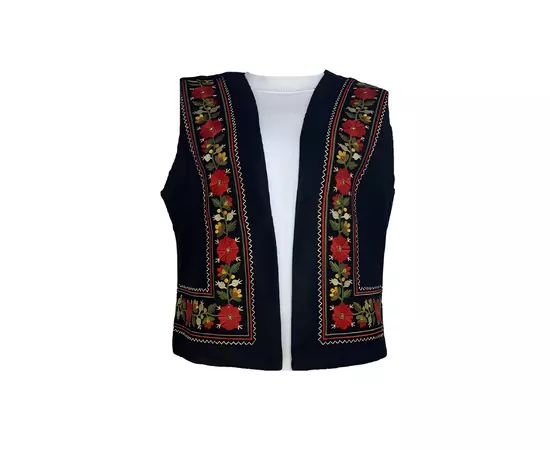Vesta traditionala neagra din stofa cu motiv floral rosu. Modelul de vesta ofera lejeritate la purtare, intrucat nu prezinta inchidere.