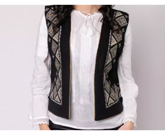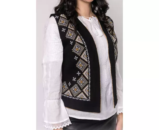 Vesta traditionala neagra din stofa cu motiv geometric multicolor. Modelul de vesta ofera lejeritate la purtare, intrucat nu prezinta inchidere.