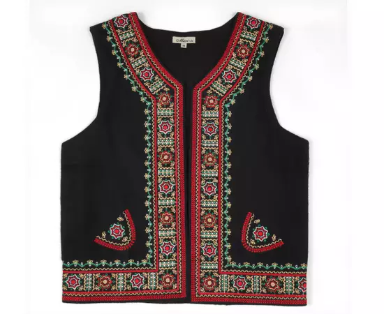 Vesta traditionala neagra din stofa cu motiv floral rosu. Modelul de vesta ofera lejeritate la purtare, intrucat nu prezinta inchidere